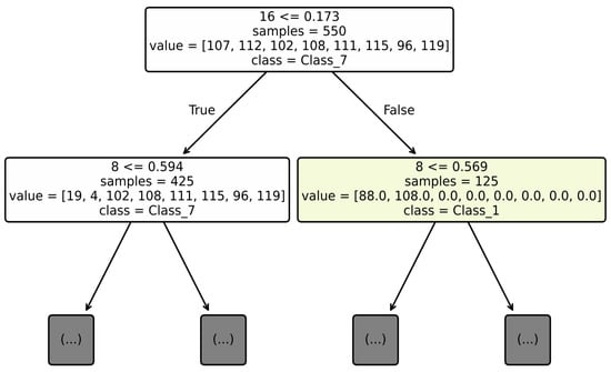 The maximum classification accuracy and the shortest time to select one CA correspond to the RF algorithm, the quality metric values of which are highlighted in bold in Table 8. The lowest accuracy corresponds to the LR algorithm. The XGBoost, AdaBoost, CatBoost, and LightGBM algorithms showed similar accuracy. Figure 11 shows an example of a fragment of the RF algorithm decision tree, for which the feature numbers are indicated in the threshold value comparison expression.