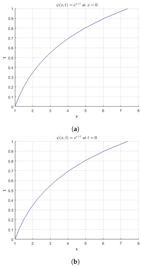 Figure 1a shows the variation solution of the non-homogeneous telegraphic equation in Equation (24) with respect to time at , while Figure 1b presents the variation of with respect to space at . Figure 1c illustrates the three-dimensional surface plot of , highlighting its behavior in both the space and the time domains.