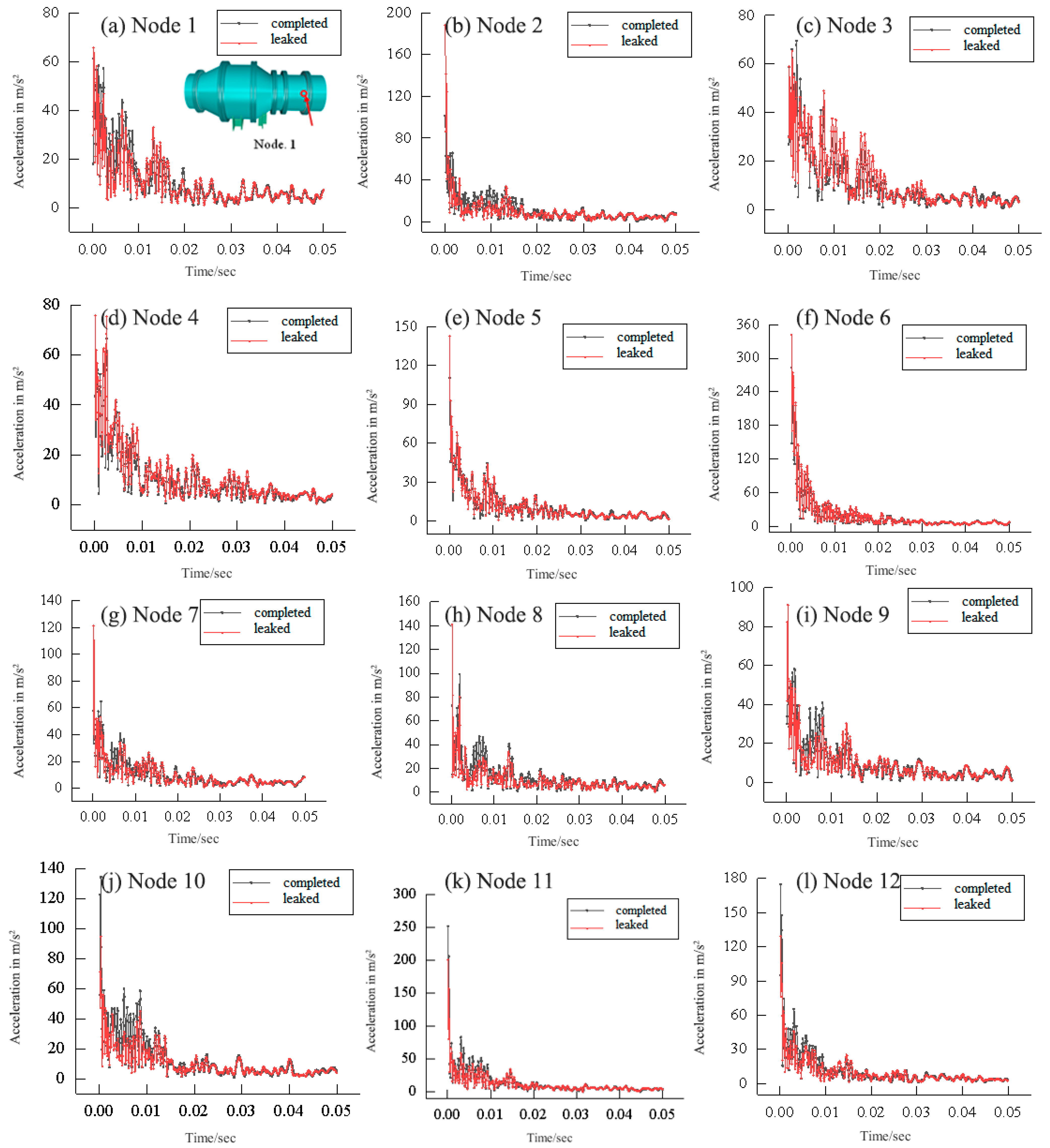 - The variation rate of maximum component energy served as a highly sensitive indicator in numerical simulations. Circular nodes 2, 7, and 8 exhibited significantly higher variation rates of 6.93%, 7.33%, and 7.9%, respectively, aligning well with the actual leakage positions and demonstrating the robustness of this metric for fault detection.