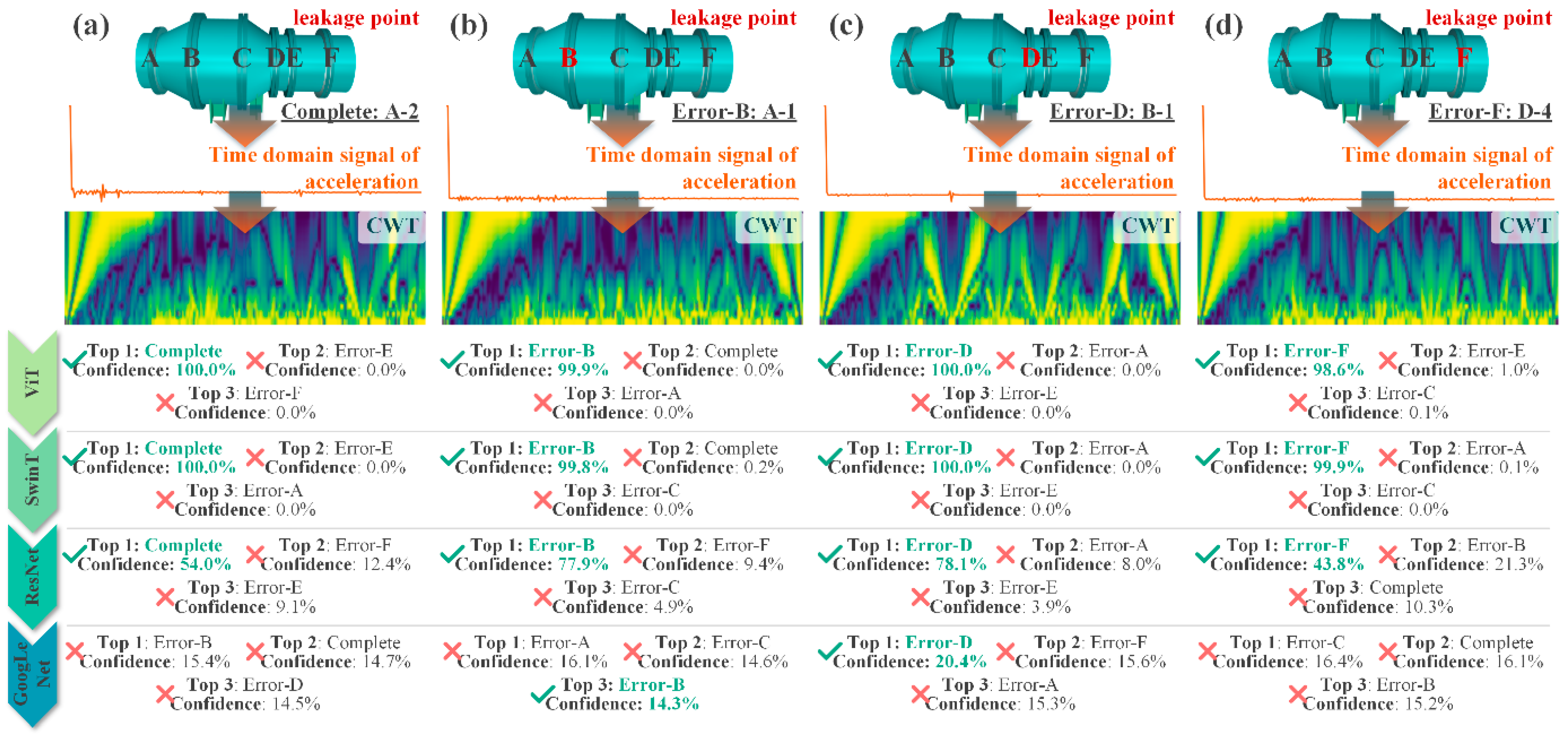 - The ViT model, trained on a dedicated database covering multiple leakage scenarios and sensor arrangements, achieved rapid and fully accurate classification of valve leakage conditions (up to 100% in the current case). Compared with SwinT, ResNet, and GoogLeNet, ViT demonstrated superior training efficiency, prediction accuracy, and reliability, providing a robust, automated, and practical approach for leakage fault diagnosis in wind tunnel valves, ultimately enhancing operational monitoring, maintenance, and safety.