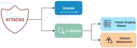 Security remains a major challenge in WSNs, along with other concerns such as limited energy, unreliable data, and unstable communication. Figure 1 categorizes attacks into directed and indirect, where directed attacks lead to packet dropping, while undirected attacks result in different misbehaviors []. These attacks are generally categorized as either direct or indirect. In direct attacks, adversaries target the Trust Management (TM) system itself, causing poor performance and faulty routing decisions that weaken the network’s overall effectiveness. If the TM process cannot reliably detect malicious nodes, especially during deceptive behaviors like on-off attacks or false feedback, these nodes may be mistakenly trusted to forward data, which leads to higher packet loss []. The configuration of TM systems involves several adjustable parameters, such as adaptive trust dynamics, forgetting factors, trust thresholds, reward and penalty systems, trust evaluation intervals, and ways to combine trust values. How well a TM system works depends on how carefully these parameters are tuned for the network’s specific needs and threats. Regardless of the approach, a strong TM solution must be able to withstand basic security threats. The main goal of Trust Management is to identify nodes that cannot be trusted and limit their influence, which improves the overall security and stability of the WSN []. For example, if a node starts dropping packets on purpose, its trust score should decrease automatically.