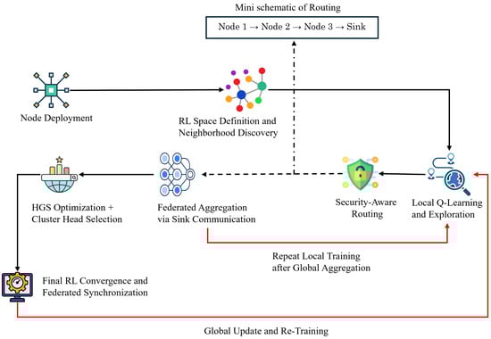 Figure 2 illustrates that each node trains a local Q-table; only the model summaries are sent to the sink for federated aggregation. A binary HGS stage shapes Cluster Heads and parent links to warm-start RL, accelerating convergence and improving energy balance. The anomaly detector continuously updates trust scores, which constrain admissible actions. The overall objective is multi-criteria: minimize energy and delay while maximizing path security.