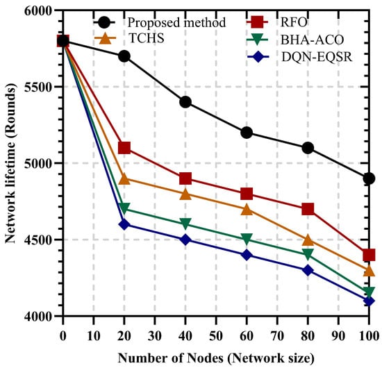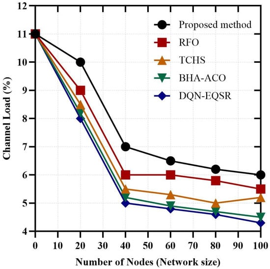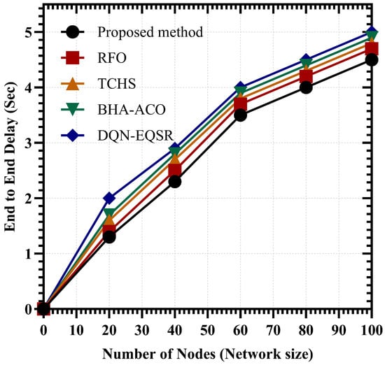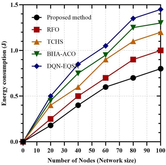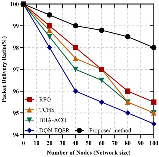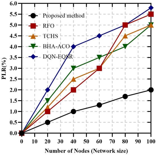 We use the identity . Accordingly, Figure 10 mirrors the trend in Figure 8. For example, at the proposed method attains ; therefore, , which is the lowest among all the methods. Figure 10 shows the PLR for different routing strategies as a percentage, based on network size. All methods see an increase in PLR as the number of nodes grows from 10 to 100, mostly due to congestion and higher communication costs. However, the proposed method consistently achieves the lowest PLR for all network sizes, showing it can reduce packet loss even in crowded networks. DQN-EQSR and BHA-ACO have the highest loss rates, going above 12% at 100 nodes. This indicates less reliability in larger networks.
