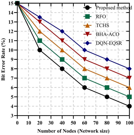 Figure 11 shows the BER as a percentage as the network size increases from 10 to 100 nodes. All methods display a downward trend, meaning that data accuracy improves as the network becomes larger. However, the proposed solution consistently achieves the lowest BER at every network size, reducing it from 15% down to just 4% as the network grows. In comparison, DQN-EQSR maintains the highest BER, staying above 8% even at 100 nodes, while BHA-ACO is the second highest. The strong performance of the proposed method shows its ability to provide reliable and error-resistant data transfer.