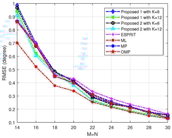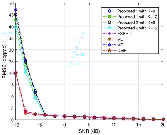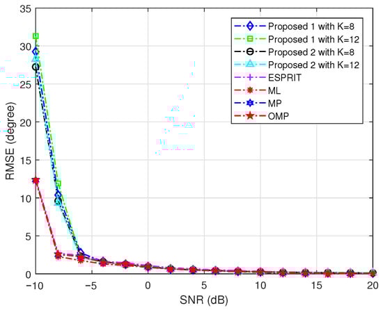 17] methods. For clarity within the results, the two variants of the proposed methodology are denoted as Proposed 1 (utilizing the Nyström approximation) and Proposed 2 (employing the reduced rank covariance matrix method). The primary performance metric is the Root Mean Square Error (RMSE), computed using the estimated DOA and the real DOA. The signal-to-noise ratio (SNR) is SNR =