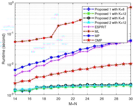 Figure 4. The results show that the proposed method is much faster than the ESPRIT, ML, MP, and OMP methods. We also observe that the proposed methods with different values of