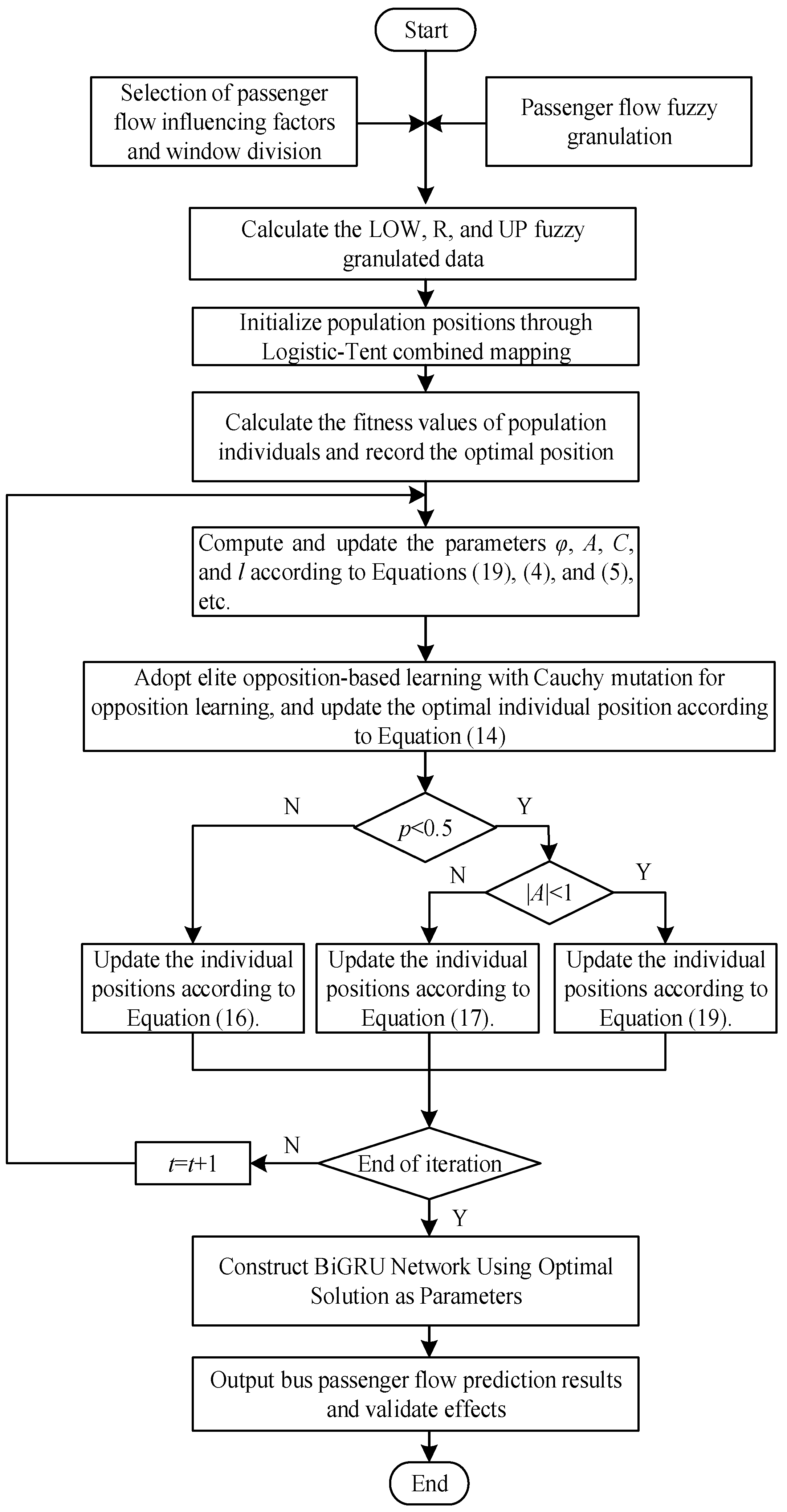 Therefore, to address the problems of WOA being easily trapped in local optima, insufficient solution accuracy, and slow convergence speed, this study adopts a Logistic–Tent combined chaotic mapping to initialize the population of WOA, thereby increasing population diversity and quality; an elite opposition-based learning and Cauchy mutation hybrid mechanism is adopted to overcome premature convergence and the tendency of WOA to fall into local optima. Moreover, improved convergence factors and inertia weights are introduced to enhance the population position update mechanism, effectively balancing the relationship between global search and local exploitation, and improving both solution accuracy and convergence speed of WOA. Based on bus passenger flow data from Harbin, the study analyzes the correlations between passenger flow, weather conditions, and passenger attributes, applies fuzzy information granulation (FIG) to the passenger flow data, and employs the improved WOA (IWOA) to optimize BiGRU parameters, thereby developing a FIG-IWOA-BiGRU model for forecasting bus passenger flow fluctuation trends and spatial distribution. By considering the impacts of passenger travel randomness and uncertainty on bus passenger flow, the model extends forecasting results from point predictions to spatial predictions. Meanwhile, the use of a hybrid-strategy-improved WOA prevents the algorithm from falling into local optima and suffering from slow convergence, which could otherwise lead to poor BiGRU prediction performance and long computation times, thus addressing the limitations in bus passenger flow data forecasting applications.
