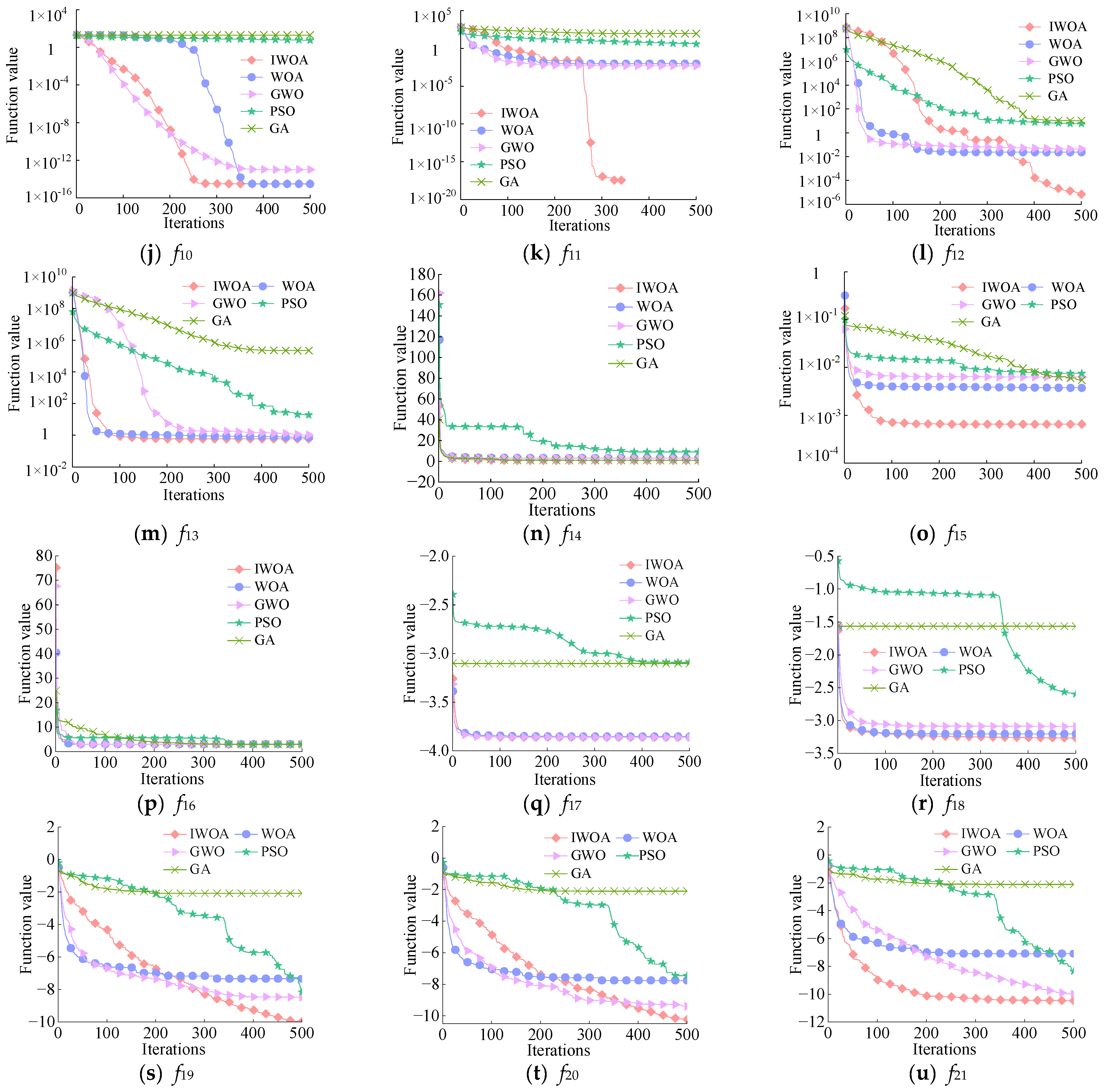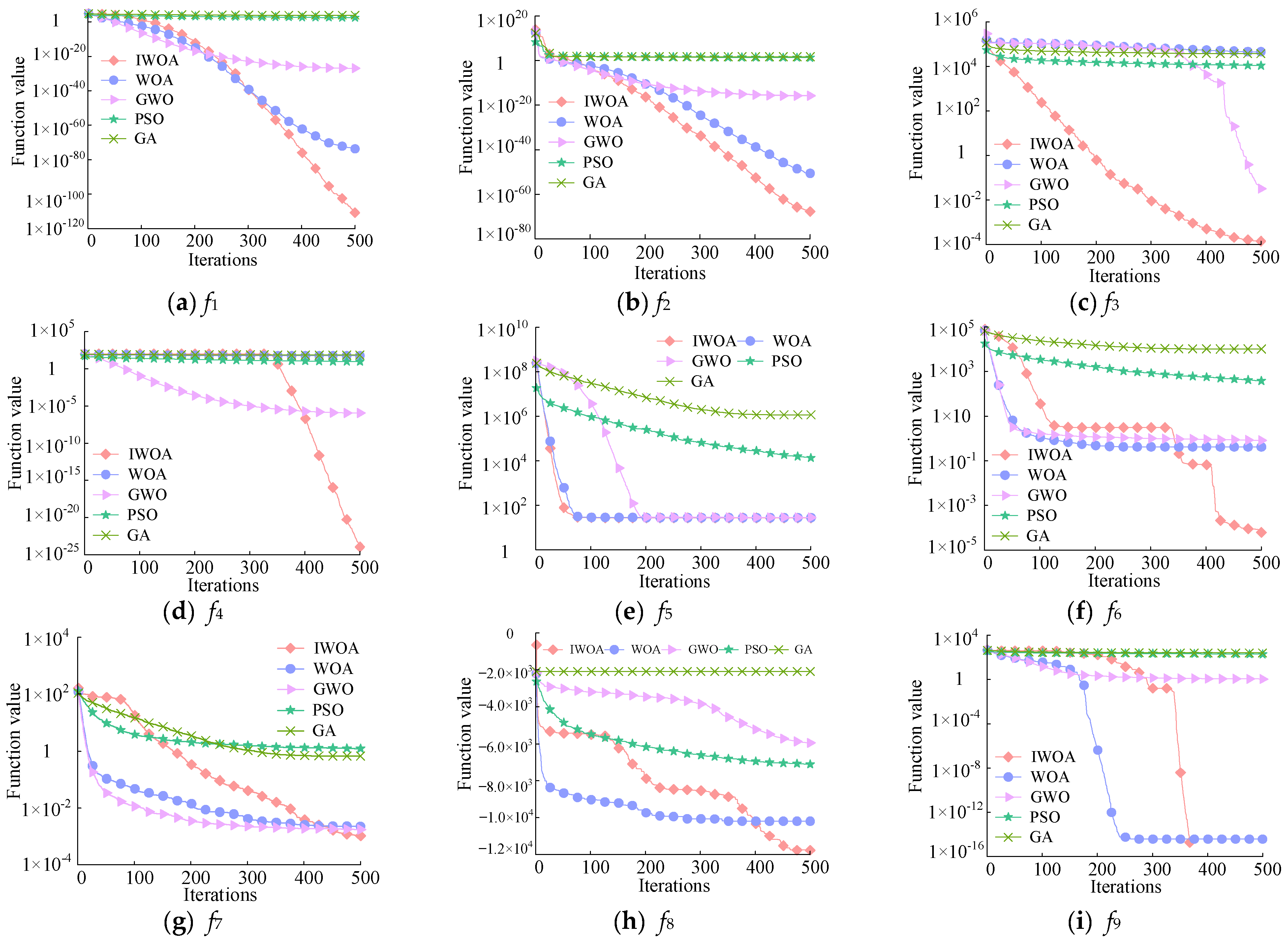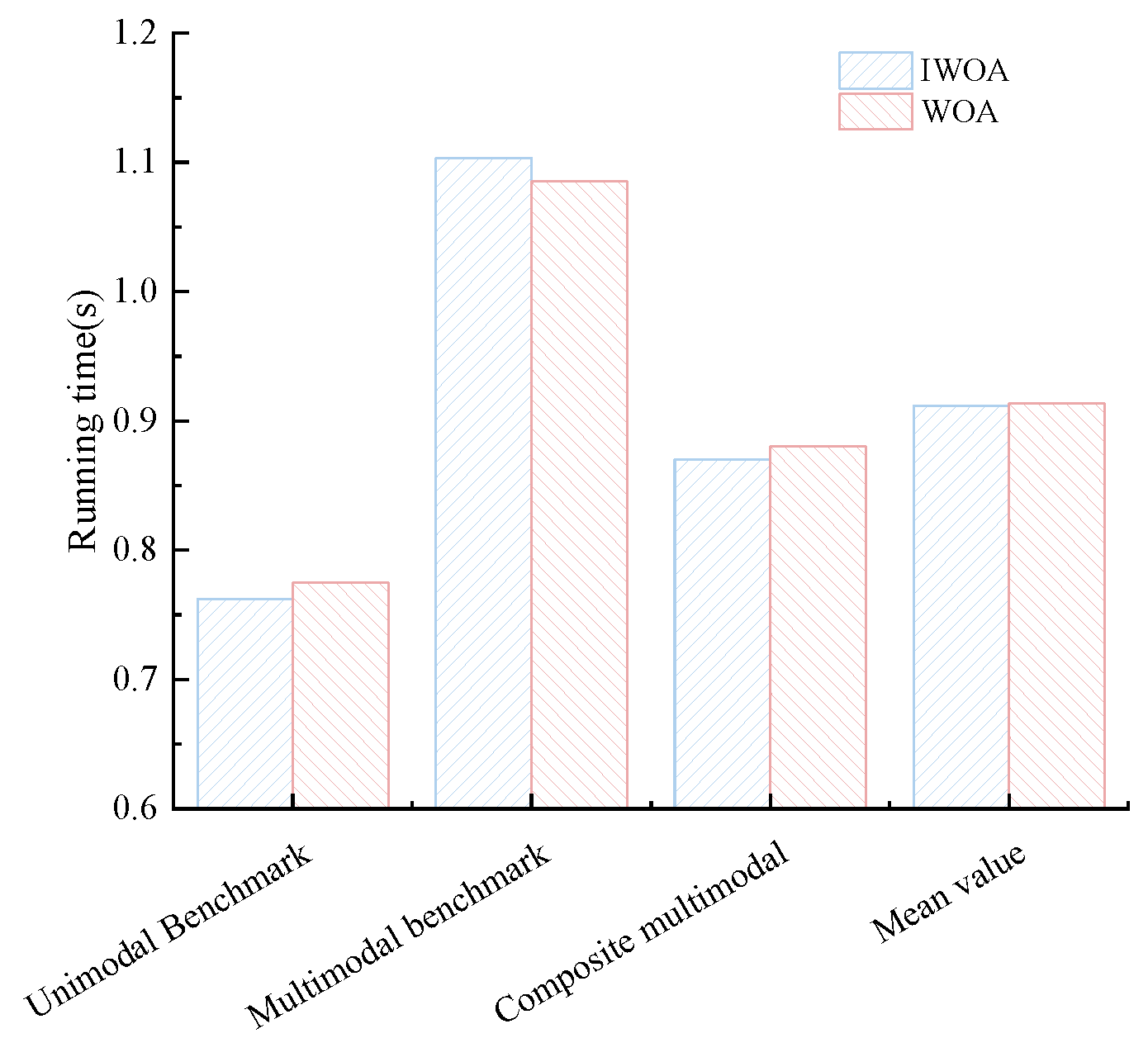 (2) This paper improves the whale optimization algorithm (WOA) with hybrid strategies, including Logistic–Tent combined chaotic mapping, an elite opposition-based learning and Cauchy mutation hybrid mechanism, and modified convergence factor and inertia weight. These strategies enhance population diversity and quality while preserving the strengths of WOA, and improve the algorithm’s capability to balance global search and local exploitation. Comparative analysis of numerical simulation results and convergence characteristics on 21 benchmark test functions shows that IWOA outperforms WOA, GWO, PSO, and GA in solution accuracy, convergence speed, and the ability to escape local optima, further validating the effectiveness of the hybrid strategy-improved WOA proposed in this study.