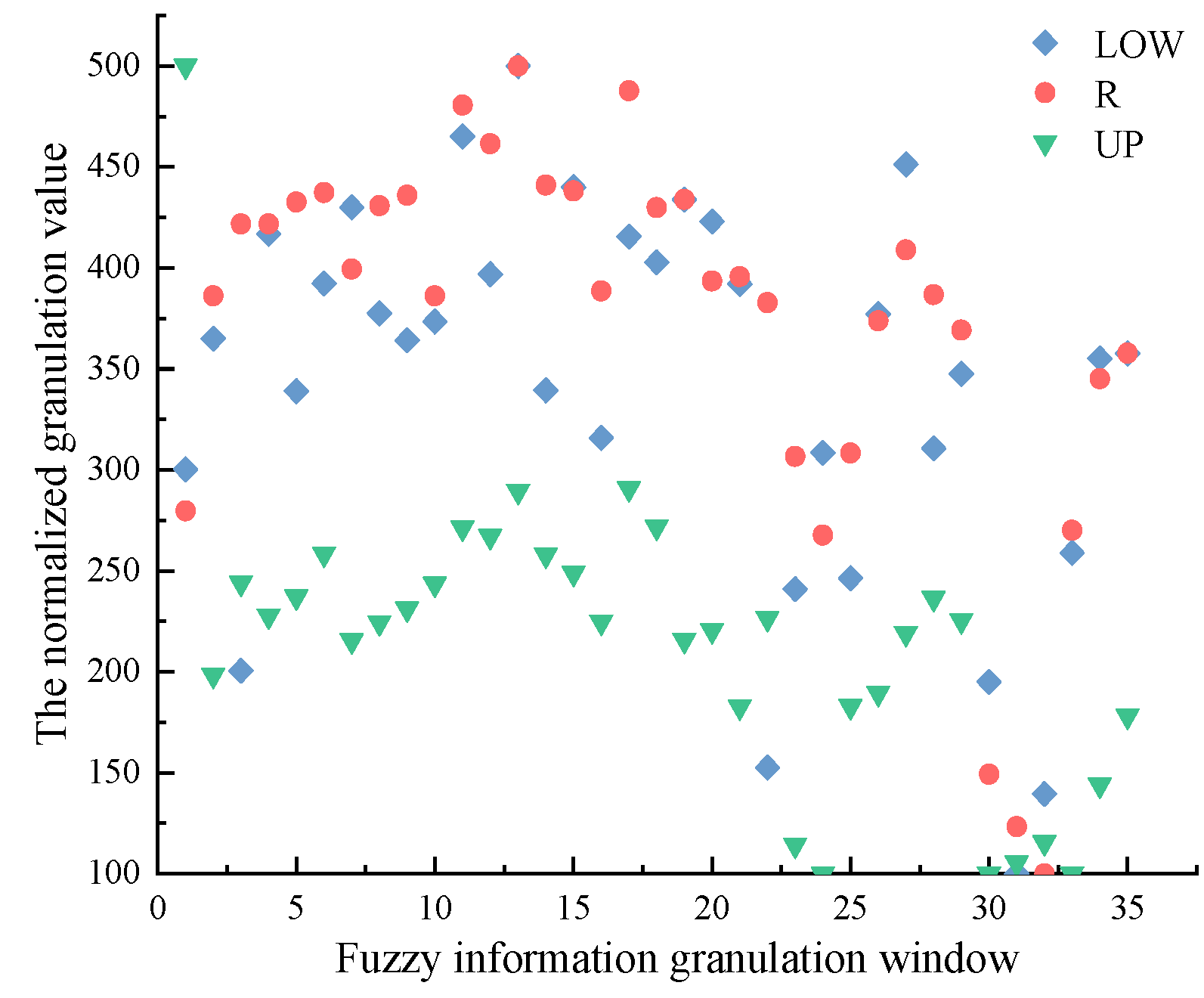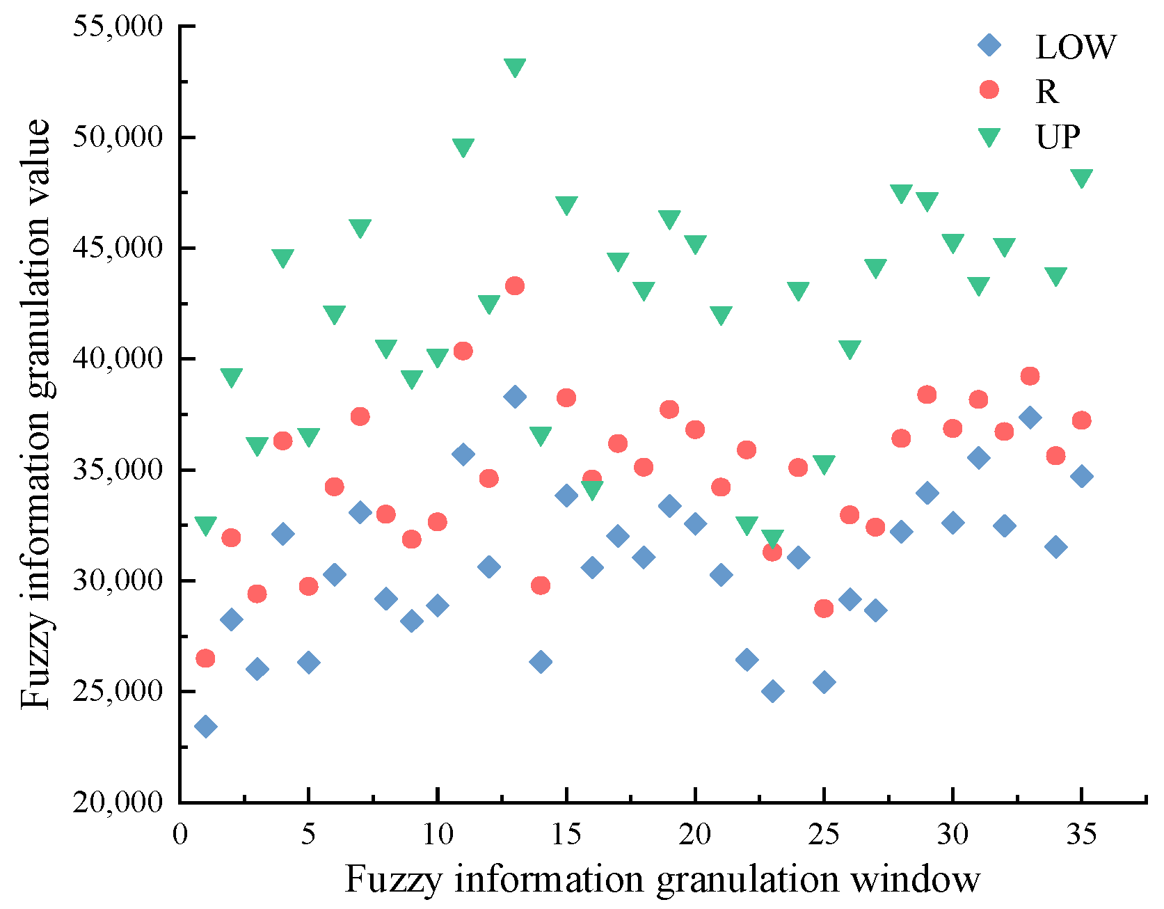 (1) This paper applies a fuzzy information granulation method, which reduces the spatiotemporal complexity of bus passenger flow data while preserving its valid information, and constructs a FIG-IWOA-BiGRU-based model for forecasting bus passenger flow fluctuation trends and spatial distribution. The MAPE values of the forecasting results for the fuzzy-granulated LOW, R, and UP window data are 7.8%, 8.1%, and 8.5%, respectively. Compared with existing forecasting models, these values improve by 1.3–3.5%, 1.5–3.7%, and 1.7–4.0%, demonstrating good prediction accuracy and robustness. The findings contribute to the reasonable prediction of bus passenger flow fluctuation trends and spatial patterns, providing data support and decision-making references for bus operation scheduling plans and for passengers in planning travel routes and times.