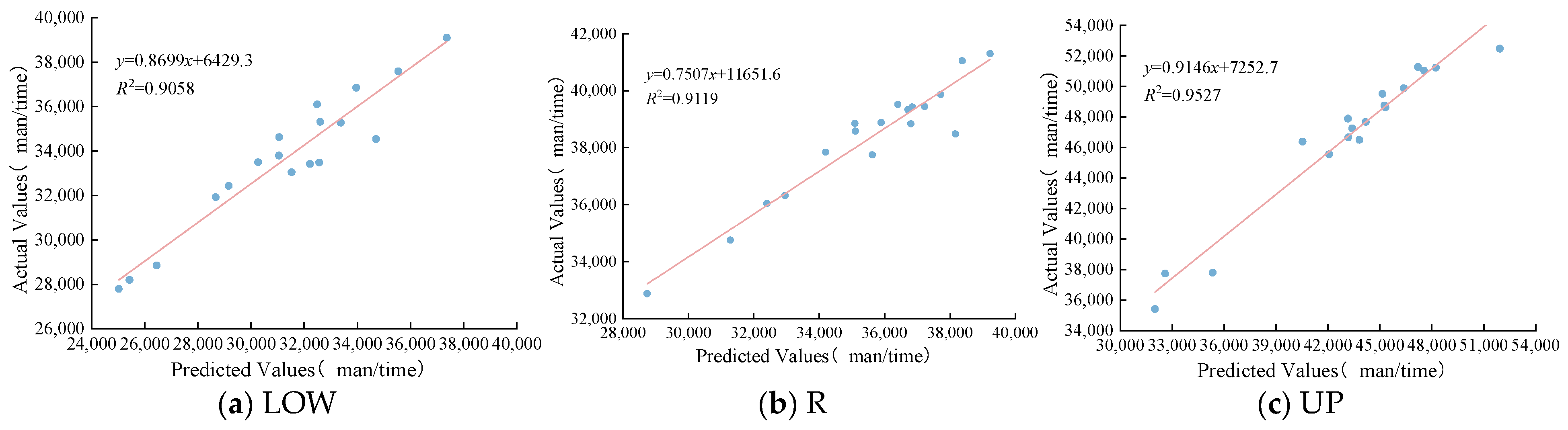 20], considering the volatility, nonlinearity, and periodicity of bus passenger flow, applied a clustering algorithm to segment passenger flow data and constructed a forecasting model based on a particle swarm optimization–support vector machine (PSO-SVM). Bus passenger flow forecasting models based on GWO-SVM [
