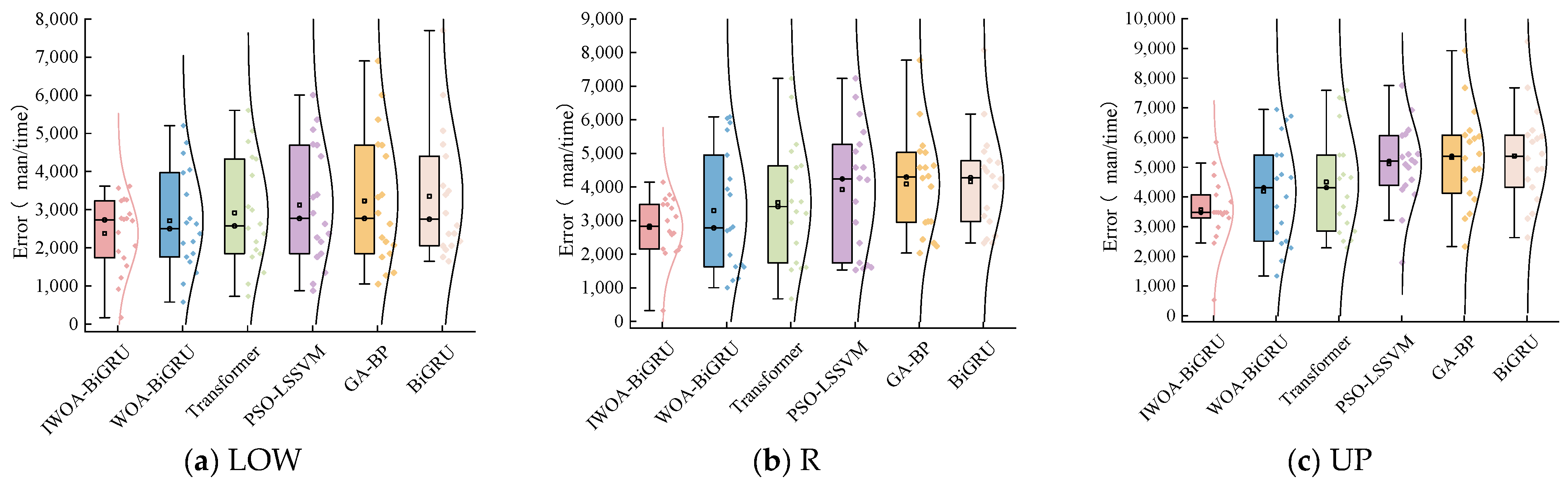 Section 4 provides the results of numerical simulation experiments based on 21 benchmark test functions and discusses the advantages of the improved whale optimization algorithm compared with other metaheuristic algorithms. The results of the FIG-IWOA-BiGRU bus passenger flow fluctuation trend and spatial forecasting model are then presented, followed by a comparative analysis of the accuracy and applicability of the proposed model and existing models.