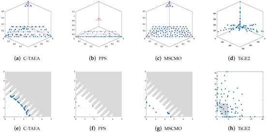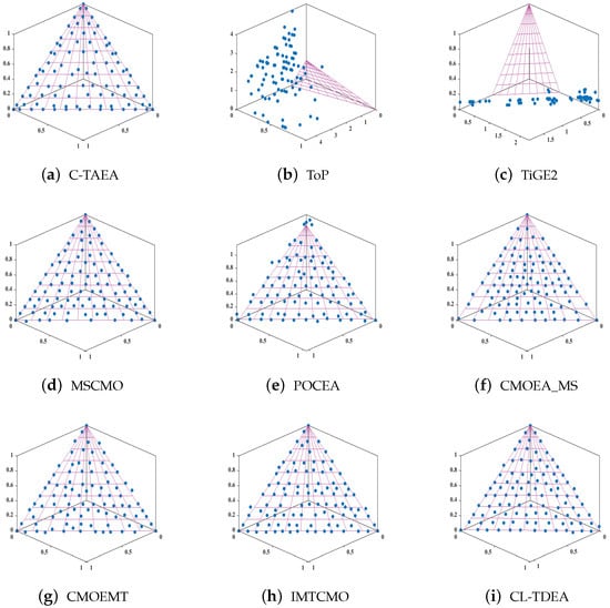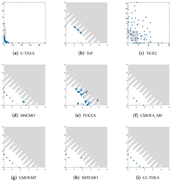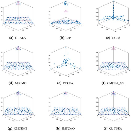 For instance, in comparative experiments, some algorithms, such as TiGE2 (Figure 6c,e), tend to exploit feasible regions far from the PF, which often leads to stagnation in local areas of the search space. While such behavior qualifies as exploitation under the standard definition, it contributes little to convergence. In contrast, algorithms shown in Figure 6a,g–i, including our proposed CL-TDEA (Figure 6i), focus exploitation near the CPF. Specifically, CL-TDEA leverages a two-stage population mechanism and adaptive learning strategies to guide the population across infeasible regions and concentrate exploitation around the CPF. This results in more effective convergence and higher-quality solution sets.