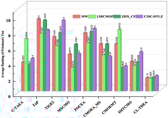 In this work, four test suites (i.e., MW [37], LIRCMOP [38], ZXH_CF [39], and C_DTLZ [40]) are selected to test the performance of algorithms. In comparative experiments, the numbers of objective functions (m) and decision spaces (D) of all algorithms are kept in accordance with the platform’s default settings, ensuring fairness in the comparative experiments.