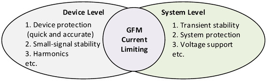 The technology of power converter protection against overcurrent is usually implemented as software with the help of the current saturation algorithm (CSA) as part of the VSG control. In case of disturbances in the grid (short circuits, overloads, voltage and frequency changes, etc.), the power converter switches to the current-limiting mode, and the main control loops of the VSG algorithm are blocked. This fundamentally changes the dynamics of the power converter operation and affects the processes in the power grid. In particular, the functions of formation of reference voltage for the grid, synchronization, etc., are blocked, which is unacceptable for the grid-forming inverters. At the same time, the number and importance of system services performed by the grid-forming inverters increase, for the power system stability. In this regard, it is necessary to take into account their ensuring in the current-limiting mode; however, at the same time, it is also necessary to maintain the response speed and accuracy of the CSA for the protection of the power converter itself. Observance of this trade-off is a difficult task, which is illustrated in Figure 1 [11].