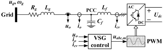 Figure 2 shows the overall structure of the grid-connected power converter with an output LC filter with parameters Lf and Cf. An ideal DC voltage source Udc is used as the primary source. The controlled parameters of the VSG are icv is the output current of the inverter, and uo and io, the voltage and current at the point of common coupling (PCC) behind an LC filter. The pulse width modulation (PWM) is used to control the power switches, for which uabc,m is the reference voltage signal. The power grid is represented as an ideal AC voltage source with the following parameters: ug and ωg are the grid voltage and frequency, and Lg and Rg are the equivalent inductance and resistance from the PCC to the grid.