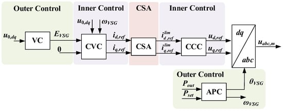 For the analysis of the processes emerging during current-limiting mode within the VSG algorithm, a generic large-signal model corresponding to the diagram in Figure 2 is formed. A traditional voltage-controlled VSG (VC-VSG) algorithm consists of outer and inner control loops operating in the dq reference frame (Figure 3) [39]. The outer ones include the active power controller (APC) and the AC voltage controller (VC). The first one is based on the known swing equation and forms the internal angle θVSG to perform Park transformations. The voltage controller forms the reference signal EVSG for the inner cascaded voltage and current controllers (CVC and CCC). The CVC and CCC are the basis for the VC-VSG structure. The CCC is the output part of the whole control system and forms the voltage reference signals udq,m for PWM. The direct CSA described earlier can be realized between the inner control loops. Figure 3 shows a generalized representation of the control scheme without detailed reflection of the control loops, which can be found in [10].