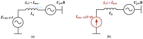Equivalent circuit of the traditional VC-VSG structure: (a) during normal operation, (b) in current-limiting mode.