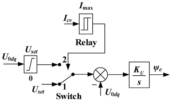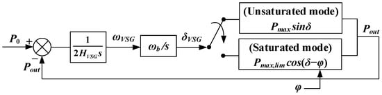 Based on Equations (1) and (2), a nonlinear model can be formed that describes the behavior of the traditional VC-VSG during normal operation and in current-limiting mode (Figure 5). It can be seen that the current phase φ is a freely set value and is not included in the continuous control loop.