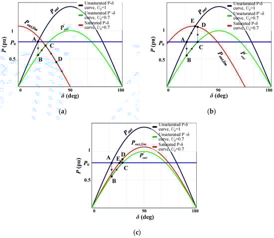 With the help of the obtained nonlinear model, the power-angle P-δ curves for different operating modes of the VC-VSG were plotted. The unsaturated power-angle P-δ curves are based on Equation (1). The saturated power-angle P-δ curves are based on Equation (2). Figure 6 shows the power-angle curves corresponding to normal operation and current-limiting mode due to overload occurrence with different values of the angle φ = (0°, 45°, 90°) [44]. In normal operation, the VC-VSG operates at the equilibrium operating point A on the curve that corresponds to the voltage source (Figure 6a). When a disturbance leading to a current-limiting mode occurs, e.g., as a result of a voltage sag in the grid, the operating point is moved to point B. Next, under the accelerating power P0, the operating point moves to point C, where a transition to the P-δ curve for the current-limiting mode occurs. At the same time, the accelerating power P0 is still greater than the decelerating power Pout, which leads to a further increase in the angle towards point D, causing instability of the VC-VSG. The situation is improved by shifting the P-δ curve in the current-limiting mode by the angle φ = 45° (Figure 6b). In this case, the power balance and the inverter stability at point C are achieved. When the grid voltage is restored, there is a transition to point D on the shifted curve. At this point, the decelerating power Pout exceeds P0, which contributes to the reduction in the angle δ and the movement of the operating point to point E. Then, the inverter exits the current-limiting mode at point A. Thus, the shift in the P-δ curve in the current-limiting mode contributes to the stability improvement. However, the situation changes if the shift is even greater with φ = 90° (Figure 6c). When the grid voltage is restored, the operating point under the decelerating power Pout will move from point C to D and then to E, at which the power balance will be achieved. As a result, there will be a VC-VSG algorithm lock-up in the current-limiting mode under normal operating conditions.