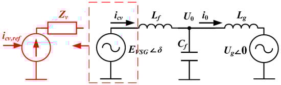 Based on Equation (4), the equivalent circuit of the CC-VSG has the form of a current source connected to the grid through a virtual impedance (Figure 7) [46]. This algorithm was described in detail earlier in [47], where it was also compared with various analogs. However, the behavior of its operation in the current-limiting mode has not been considered so far.