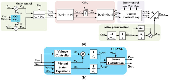 Structural diagrams of the (a) proposed CC-VSG, including the CSA, and (b) control loops reproducing the dynamics of the virtual synchronous machine.