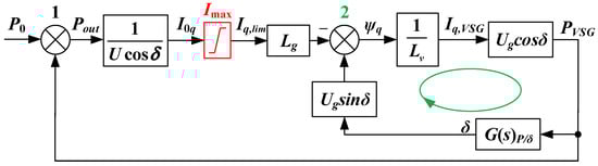 The fundamental difference lies in the formation of the angle δ. As follows from the structural diagram (Figure 9), there are two negative feedbacks: (i) for adder ‘1’ by power and (ii) for adder ‘2’ by voltage. In the current-limiting mode, the feedback for adder ‘1’ is no longer operating, in the same way as for the traditional VC-VSG structure. However, unlike the latter, the angle δ continues to be controlled by the second feedback (highlighted in green) until zero is formed at adder ‘2’. Physically, this corresponds to the achievement of both PVSG = 0 and the power balance. On this basis, Equation (10) can be formed, which reflects the steady-state value of the angle δlim in the current-limiting mode.