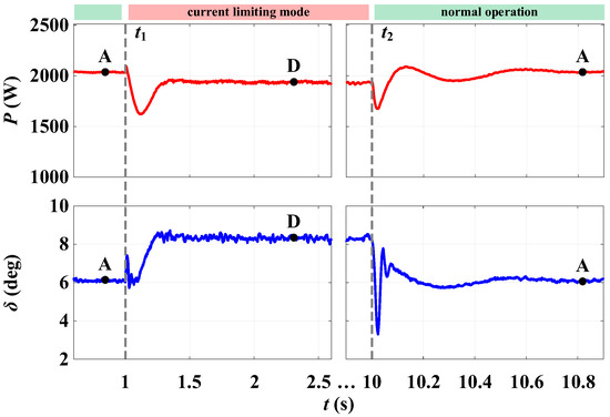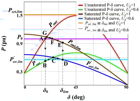 When a similar disturbance occurs (Section 2.1), the operating point moves from the normal state A to B, which is located on the P-δ curve, corresponding to the reduced grid voltage (green curve in Figure 10). Then there is a movement to point C under the accelerating power P0 and a transition to the P-δ curve in the current-limiting mode (blue curve in Figure 10). As can be seen earlier for the traditional VC-VSG, the movement to point D occurs under the accelerating power P0 with further inverter instability. However, for the developed CC-VSG structure, the movement to point D will occur until the moment of reaching a new power balance at a specific angle δlim, which is determined by Equation (10). At point D, the new value of the reference power is described by Equation (11) and depends not only on the grid parameters, but also on the controlled angle δlim: