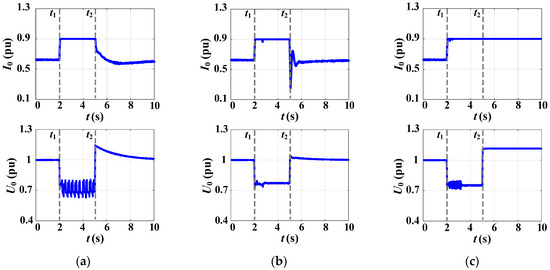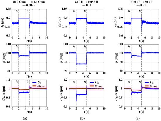 Simulation results for the proposed CC-VSG with the CSA under step change in RLC-load: (a) R-load, (b) L-load, (c) C-load.