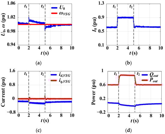 Simulation results for the proposed CC-VSG with the CSA under active power reference change: (a) RMS voltage at the PCC and VSG frequency, (b) RMS output inverter current, (c) VSG currents, and (d) output active and reactive power.