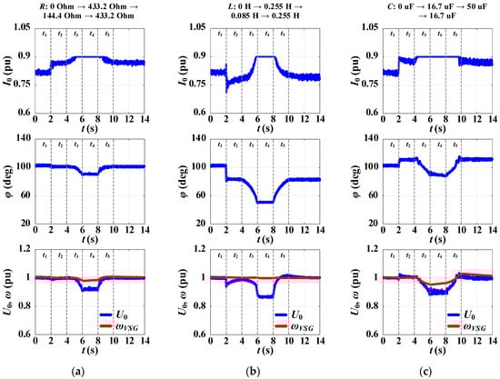 Simulation results for the proposed CC-VSG with the CSA under gradual change in RLC-load: (a) R-load, (b) L-load, (c) C-load.