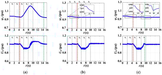 When φ = 0°, instability in the current-limiting mode occurs, which is expressed in the form of undamped voltage oscillations (Figure 13a). This characteristic of the process is caused by the infeasibility of achieving the power balance in the existing operating conditions due to the selected angle φ. At the same time, the normal operation occurs after the voltage is restored. When the angle is increased up to φ = 45°, inverter stability in the current-limiting mode and a successful transition out of it are obtained (Figure 13b). Consequently, the specified value of the angle is suitable for ensuring stable operation of the VC-VSG under the considered disturbance and grid parameters. If the angle is increased up to φ = 90°, the stable operation in the current-limiting mode is also obtained. However, after voltage restoration, the VC-VSG continues to operate in the limiting mode with the maximum allowable current Imax, which leads to the overvoltage (Figure 13c). Such a value of the angle φ turns out to be excessive for the emerging operating condition. In summary, the obtained simulation results confirmed the theoretical conclusions made in Section 2.1 about the necessity of continuous control of the output current phase for the VC-VSG inverter.