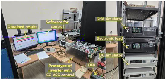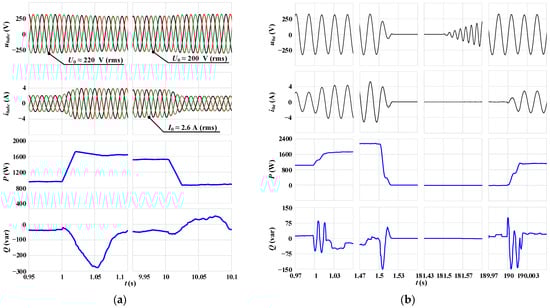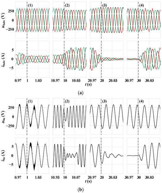 A sequence of events including (1) synchronization of the inverter with the grid, (2) inverter transition to the stand-alone operation with load supply, (3) load disconnection, and (4) load connection is considered as the next experiment. The obtained results for the developed inverter with the CC-VSG and CSA are shown in Figure 23a, and for the hybrid inverter—in Figure 23b.