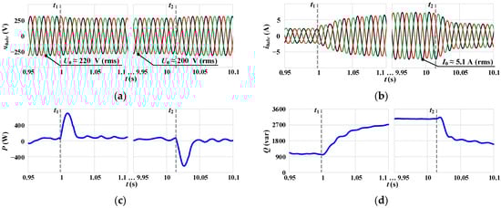 Waveforms for the developed prototype with CC-VSG control under grid voltage changes: (a) instantaneous three-phase voltages at the PCC, (b) instantaneous three-phase output currents, (c) inverter output active power, and (d) inverter output reactive power.