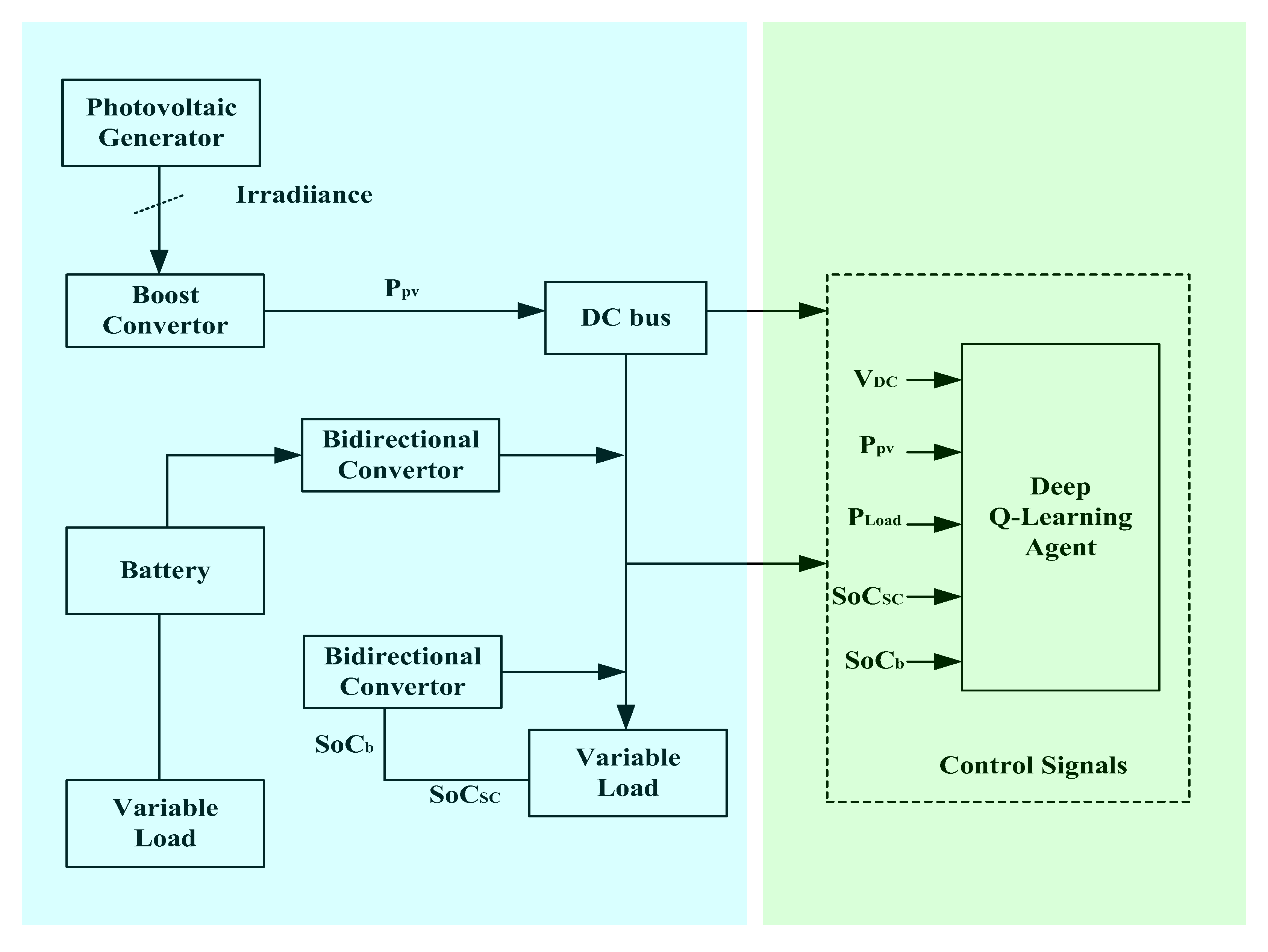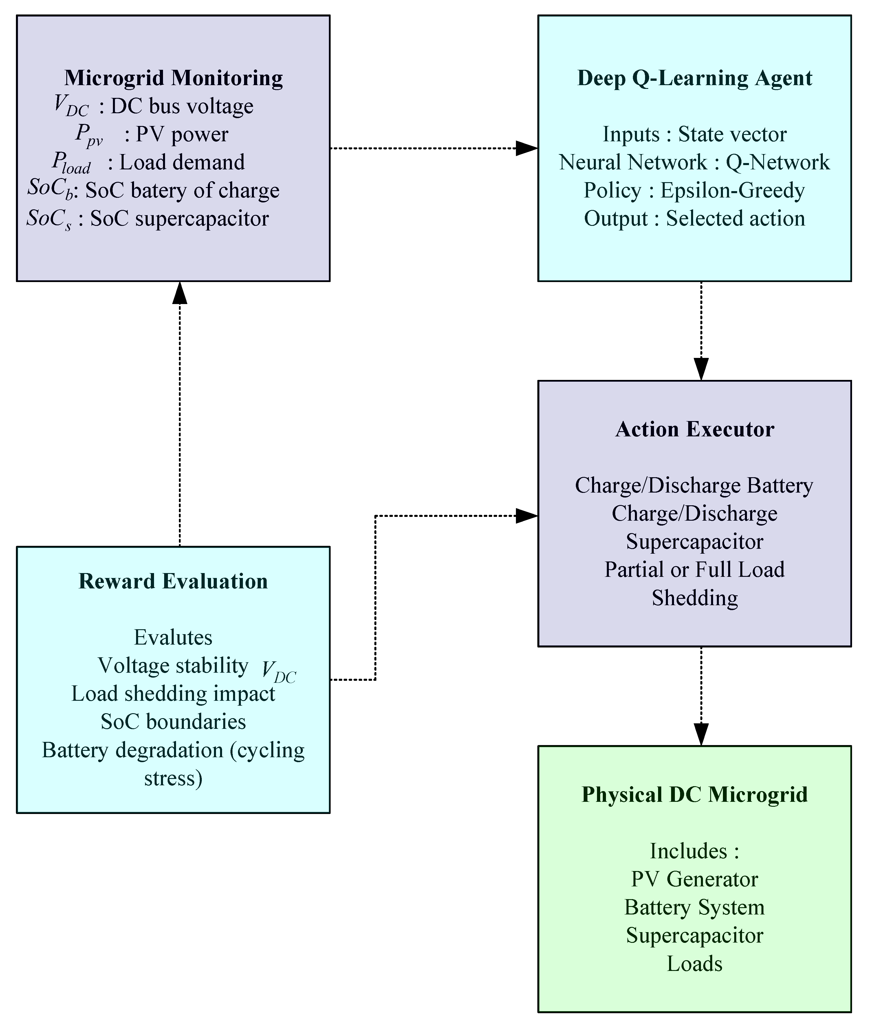 Building upon these foundational studies [7,13], this paper introduces an enhanced energy management system that incorporates a DQL strategy to optimize real-time operations of energy storage units, including charging, discharging, and load shedding. The objective is to maintain DC bus voltage stability, extend the lifespan of storage components, and improve the overall efficiency of the microgrid under dynamically changing conditions.