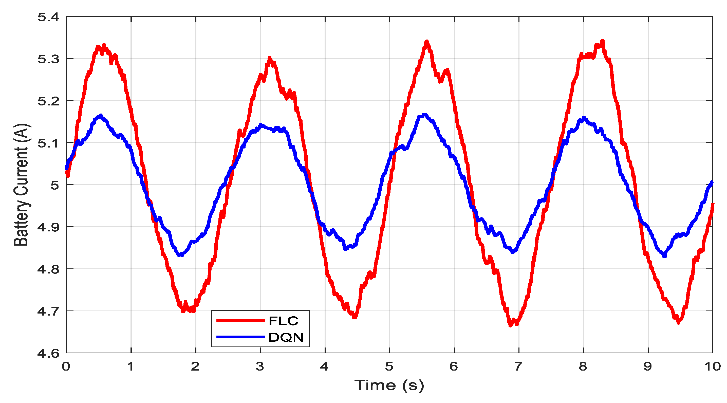 Figure 6. Battery Current analysis using FLC and DQN methods.