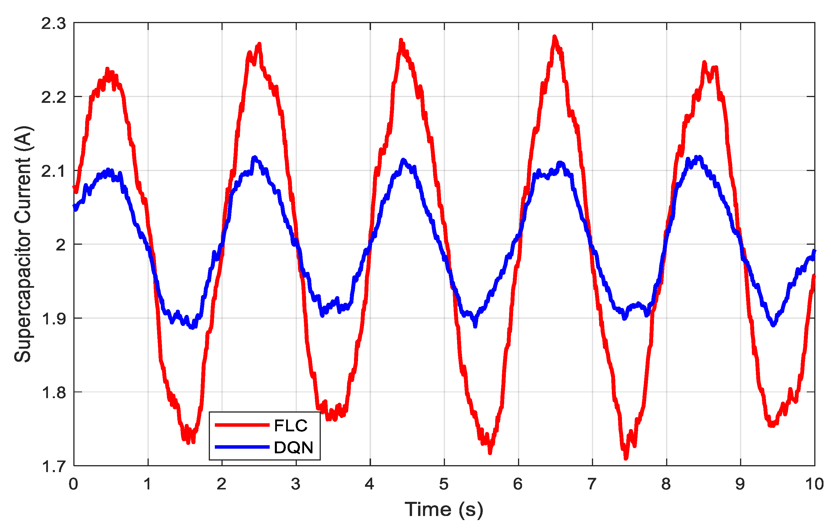 Figure 7. Supercapacitor current analysis using FLC and DQN methods.