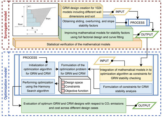 Specifically, the developed FFD-SM provides fast and dependable predictions of GRW stability factors and is incorporated as a constraint in the optimization process to ensure safety while determining optimal wall configurations. This integration enables the adjustment of wall stability and dimensions within a short computational time, accommodating various size combinations to achieve the optimal design outcome. Figure 1 illustrates the research framework, the mathematical models employed, and the overall scope of the study.