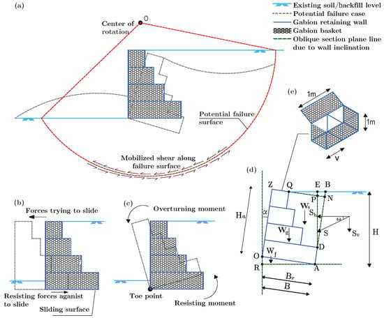 Gabion retaining wall: (a) slope stability check, (b) sliding check, (c) overturning check, (d) design parameters and acting loads, (e) gabion basket detail.