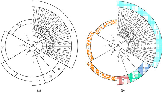 Figure 3b has been recreated by taking into account the general representation of the 1024 combinations given in Figure 3a [36]. In Section 1 (turquoise color), a total of 64 distinct combinations were generated for constant value, which is a subsection of , by analyzing all possible combinations of , , and along with their respective levels. The same characteristic was applied in Section 2 (blue color), Section 3 (green color), and Section 4 (red color), each of which consists of 64 different combinations for the constant values of , , and , respectively. Thus, 256 distinct combinations were formed with the first level of the first parameter () held constant. This rule was considered in the case of Sections 5, 6, and 7 (turquoise) for , , and , respectively. Sections 5, 6, and 7 include the content of Sections 1–4, along with their respective subsections.