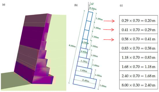 The wall designs incorporate gabion baskets with a height of 1.0 m, while the width of each row has been reduced by the gabion basket width reduction ratio (). If the width of the obtained gabion basket is less than 0.50 m, it is considered to be 0.50 m. Figure 4 presents an example wall design utilizing the GEO5 model, characterized by the parameters H = 8 m, , , , and .