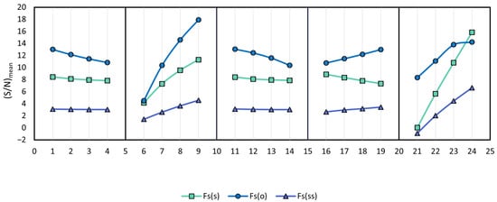 is the sum of all ratios in the jth level of the ith parameter. represents the total number of combinations used to calculate . For example, represents the sum of the ratios determined for all combinations, which is H = 4m (), with equal to 256 (in Figure 3, Section I). After this calculation process, the obtained mean signal-to-noise ratios for the safety factors , , and across all parameters and levels are presented in Figure 5.