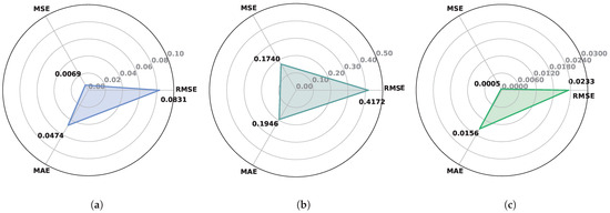 MAPE values were obtained as 1.4479, 3.0352, and 1.0418 for sliding, overturning, and slope stability safety factors, respectively. While the sliding and slope stability models demonstrated reliable performance with low error rates, the overturning model exhibited slightly higher deviations. The RMSE, MAE, and MSE values shown in Figure 6 are low and acceptable, signifying commendable model performance. The minimum error rate for the sliding model (Figure 6a) was recorded at 0.007 for MSE, whereas the slope stability model (Figure 6c) achieved a metric of 0.005. The metric values derived from the overturning model (Figure 6b) demonstrate that its performance is inferior to that of the other models.