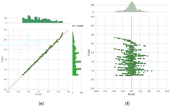 Figure 7 also displays the histograms of relative errors (), along with their distribution and the values of and . Figure 7b,d,f provide insight into the distribution of , illustrating the relationship between the actual safety factor () and with dots and a vertical reference line (). The relative positions of the dots in relation to the red dashed line highlight deviations and the accuracy of the modeled results. The Q-Q Plots (Quantile-Quantile Plots) for the and values in Figure 7a,c,e show how the intersection points of and are spread along a linear regression line, which is a dashed red reference line. In these figures, each dot indicates a paired observation comparing the modeled safety factor () and the actual safety factor (). The alignment of dots along the diagonal shows how closely the two values match. This diagonal red line represents the 1:1 correspondence ( = ). It serves as an ideal reference; the nearer the dots are to this line, the stronger the agreement between model predictions and actual values.