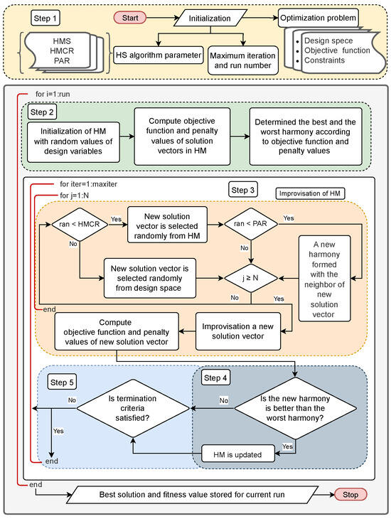 Step 1—Parameter initialization and design space creation: Set up the parameters and create the design space. The values for HSA and the range for each design variable are defined. A design space is formed using these ranges. Next, some critical HSA parameters are configured, such as Harmony Memory Size (HMS), Harmony Memory Considering Rate (HMCR), Pitch Adjusting Rate (PAR), and the maximum number of Iterations (MaxIter). Then, the run is executed. HMS is the number of solution vectors (rows) in the harmony memory (HM). HMCR determines which values are selected from the HM, and PAR controls how those values are fine-tuned.