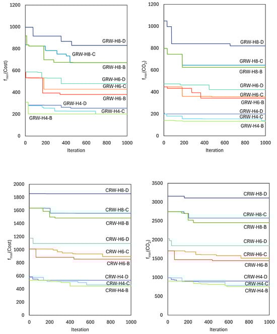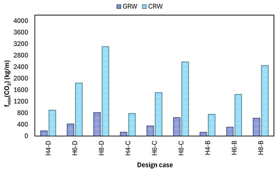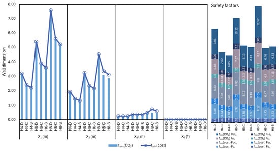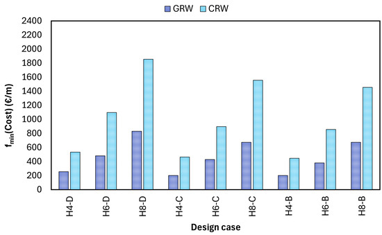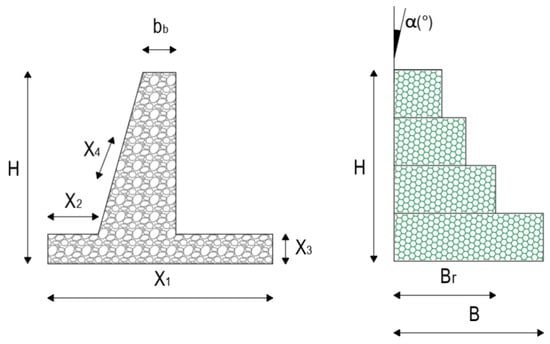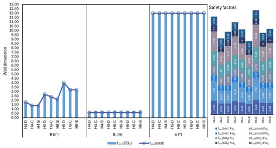 In this section, the definitions of the cantilever retaining wall (CRW) and the gabion retaining wall (GRW) optimization problems are explained. The optimization problem was addressed to derive the minimum wall costs, , and (CO2) values for the GRW and the CRW under various wall design cases, and to analyze the relationship between them. When looking at the GRW and the CRW for optimization, the wall’s geometry limits, which were based on its size and its stability, which included sliding, overturning, slope stability, and bearing capacity safety factors, were all taken into account as constraints [49]. Optimum wall designs were evaluated to ensure safety against sliding, overturning, bearing capacity, and slope stability, with allowable safety factors of 1.5, 1.5, 3.0, and 1.5, respectively [32]. In the optimization problem for GRW and CRW, wall dimensions were used as the discrete design variables, with intervals () between the lower and upper bounds. The optimization problem was defined by discrete design variables given in Figure 11: for CRW, the base width (), toe extension (), base thickness (), and front wall face inclination () are considered, while for GRW, the base width (B), the width reduction ratio of the gabion basket (), and the wall inclination () are taken into account.
