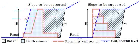 The horizontal earth pressure force (S) given by Equation (3) has a critical role in the stability of the GRW. In this study, active () pressure coefficient were obtained according to Coulomb’s Theory [30] to calculate the lateral soil pressure at the effective height (Equation (5)) as in