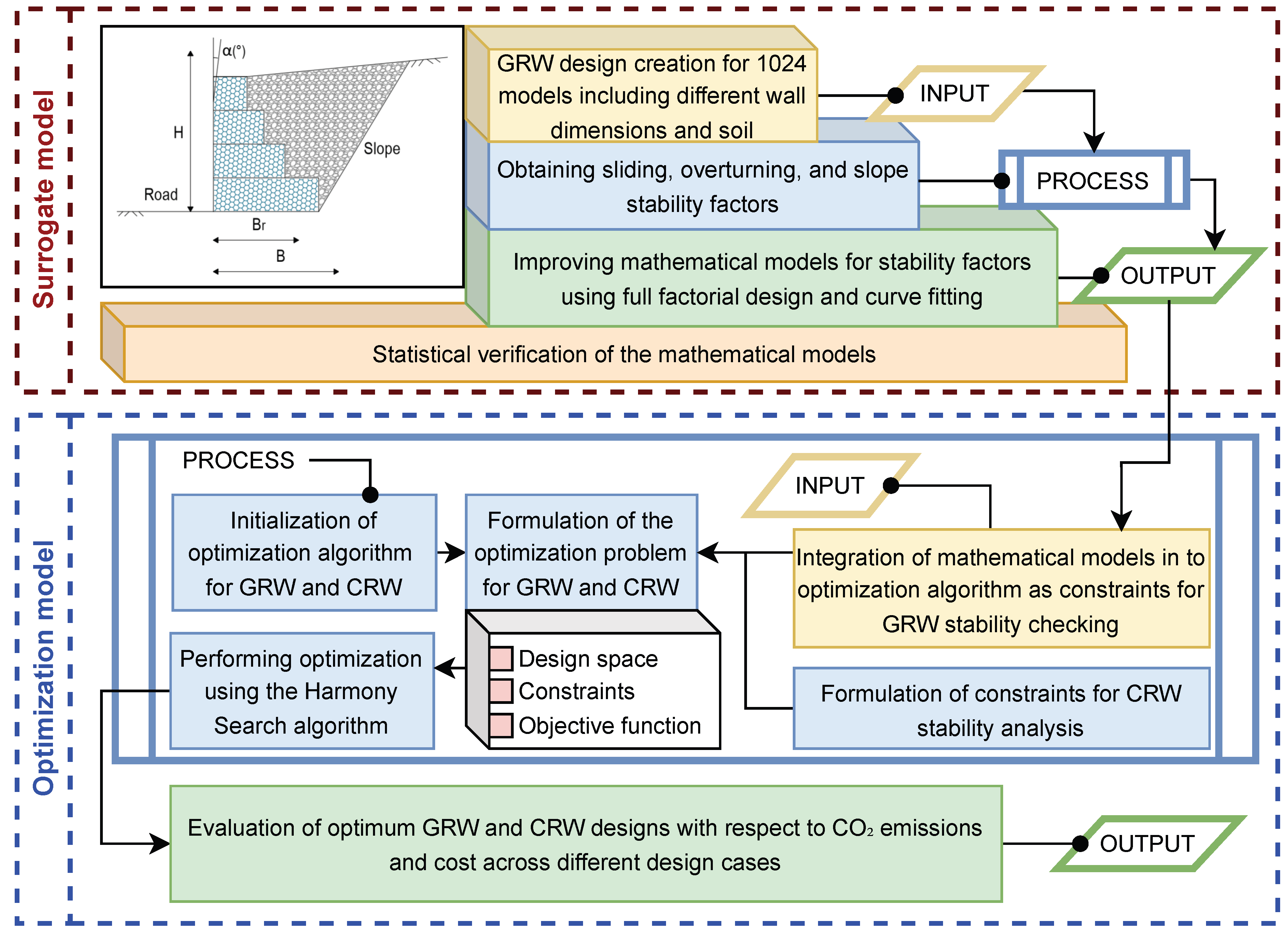 . Lower building costs and emissions are achieved with a GRW that has narrower widths in each row compared to its predecessor. Since all safety factors exceed the limit, maintaining the wall’s stability is aided by modifying