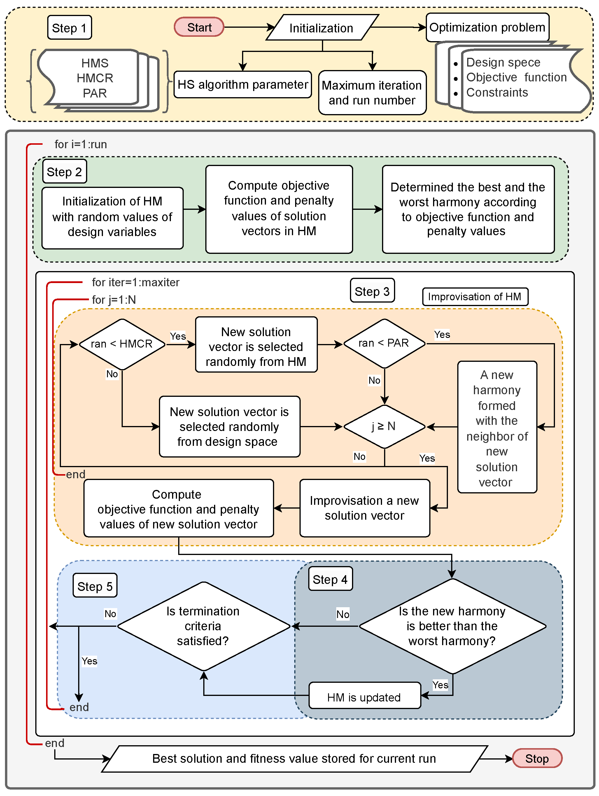 To examine the algorithm’s sensitivity and stability with respect to initial conditions, multiple independent runs were performed for each design case. Specifically, the HSA was executed 500 times, each run consisting of 10,000 iterations. The mean, median, and standard deviation (Std. Dev.) values reported in