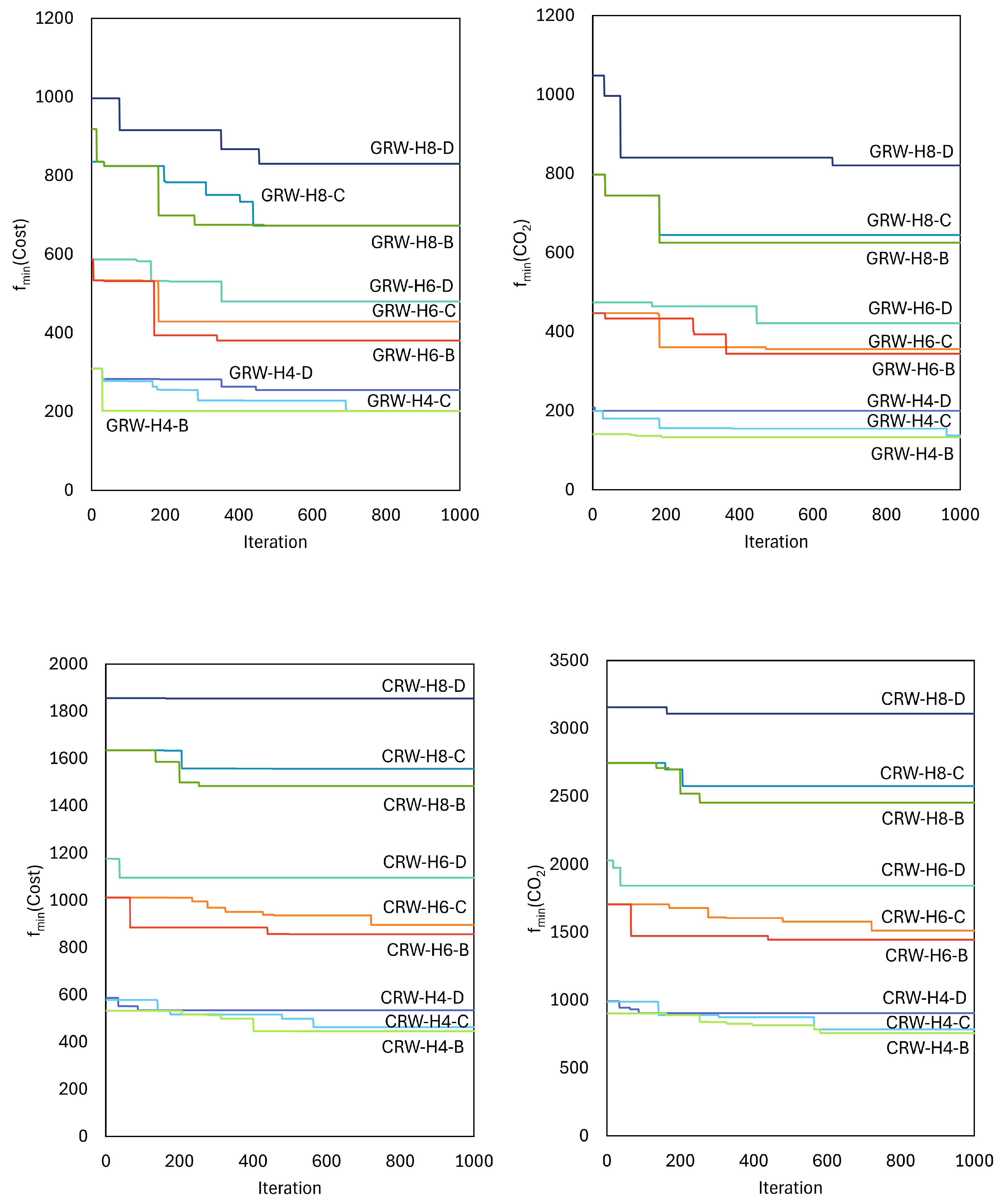This section presents the optimal CRW and GRW designs for the cases of H4-D, H6-D, H8-D, H4-C, H6-C, H8-C, H4-B, H6-B, and H8-B based on two objective functions. In optimization analyses, the best designs for CRW and GRW were identified separately for the