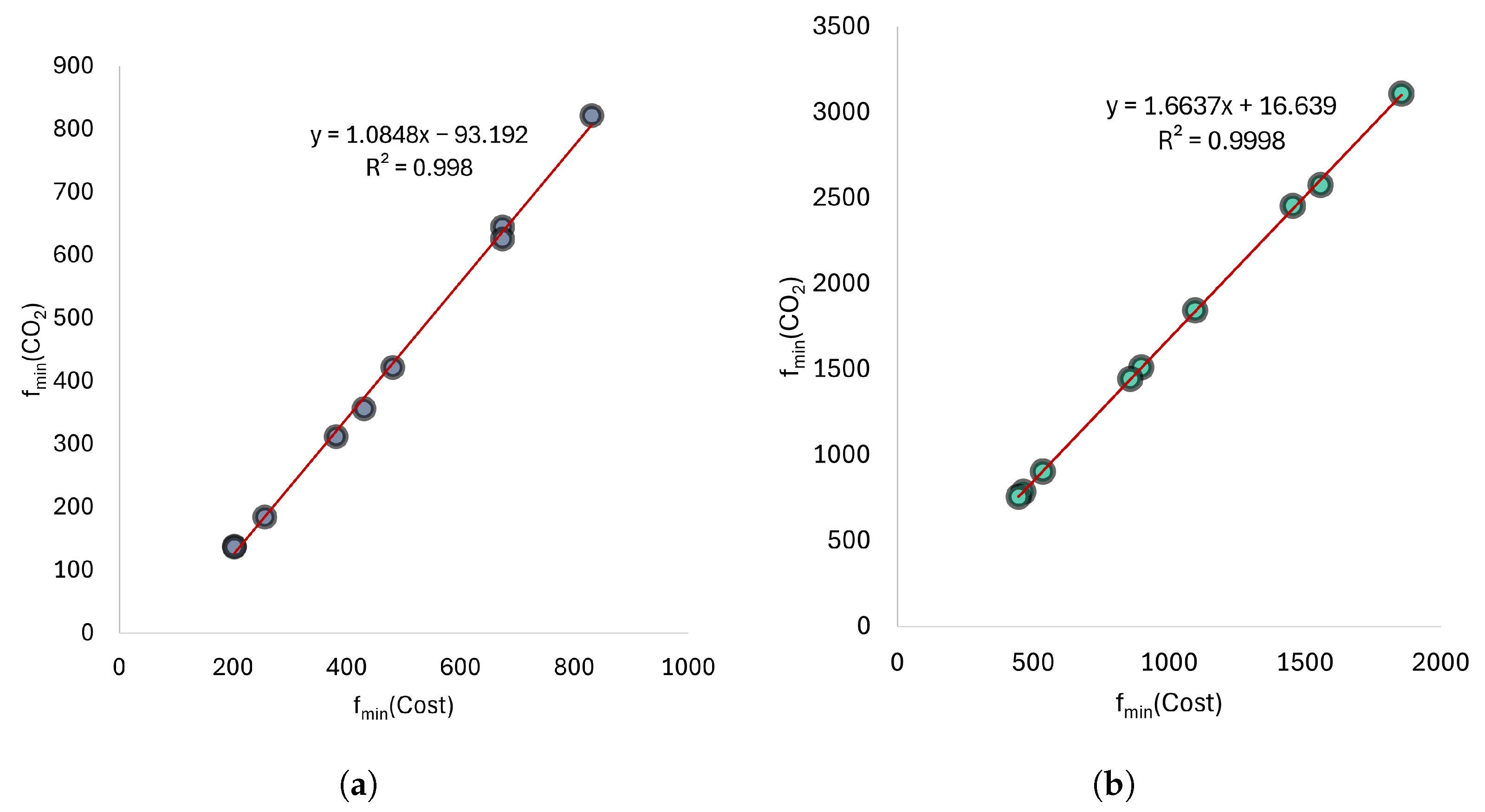 In this study, we solved two single-objective optimization problems separately—minimizing total cost